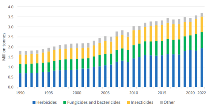 As the global population grows, the need to increase crop yields has led to a significant reliance on pesticides. Historically, pesticides have played a crucial role in protecting crops from pests and diseases, contributing to higher agricultural productivity. From 1990 to 2022, global pesticide use doubled in response to rising food demand.3