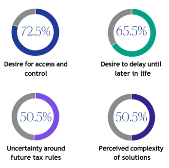 Before opening new IHT conversations with clients, be ready to navigate the concerns most commonly raised: reluctance to give up control of assets (72.5%), a belief that planning can be left until later in life (65.5%) and uncertainty about future tax rules (50.5%). Build your recommendations in a way that directly acknowledges and resolves these worries.